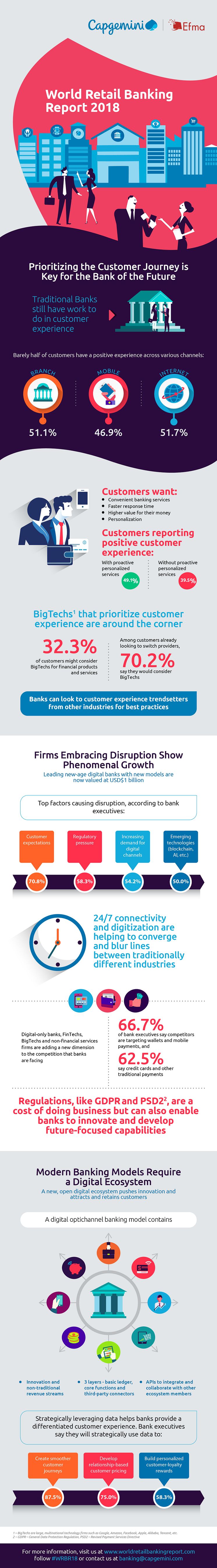 Årets World Retail Banking Report kartlägger nuvarande perspektiv och traditionella bankers potentiella utveckling, bland annat med det faktum att Bigtech och Fintech-aktörerna fortsätter att växa och utveckla sina finansiella tjänster. Rapporten innehåller data från en global undersökning med mer än 10 000 privatkunder i 20 länder och intervjuer med 60 ledande bankchefer på 23 marknader.