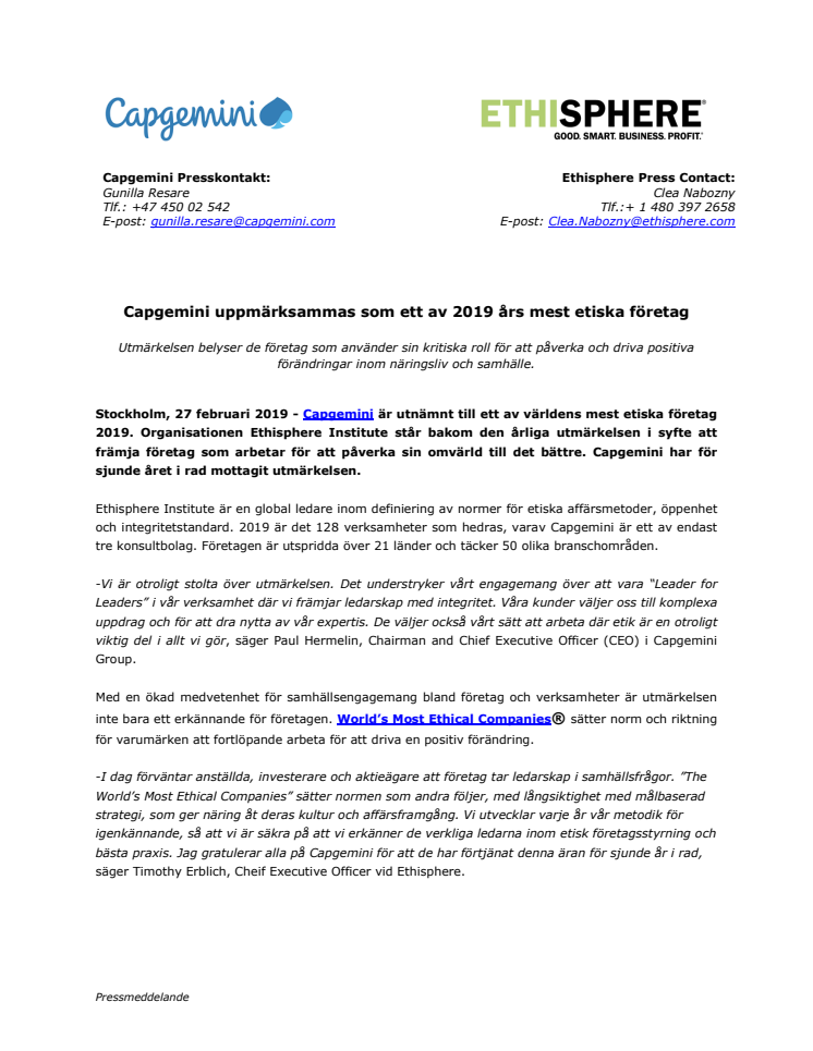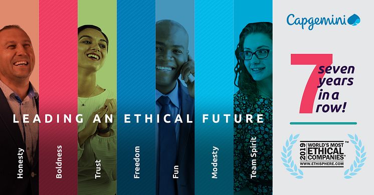 Capgemini är utnämnt till ett av världens mest etiska företag 2019. Organisationen Ethisphere Institute står bakom den årliga utmärkelsen i syfte att främja företag som arbetar för att påverka sin omvärld till det bättre. Capgemini har för sjunde året i rad mottagit utmärkelsen.