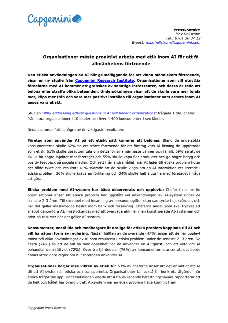 Den etiska användningen av AI är grundläggande för att vinna människors förtroende, visar en ny studie från Capgemini Research Institute. Organisationer som vill utnyttja fördelarna med AI kommer att granskas av samtliga av företagets intressenter, och dessa kommer att att belöna eller straffa olika beteenden. Undersökningen visar att de skulle vara mer lojala mot, köpa mer från och vara mer positivt inställda till organisationer vars arbete inom AI anses vara etiskt.