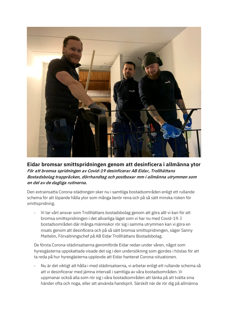 För att bromsa spridningen av Covid-19 desinficerar AB Eidar, Trollhättans Bostadsbolag trappräcken, dörrhandtag och postboxar mm i allmänna utrymmen som en del av de dagliga rutinerna.