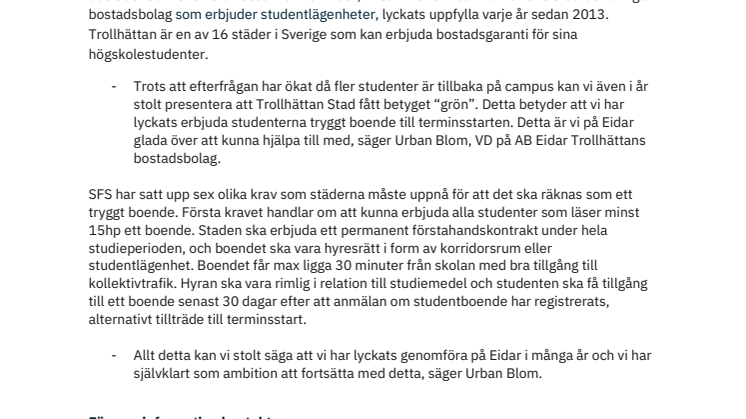 -Trots att efterfrågan har ökat då fler studenter är tillbaka på campus kan vi även i år stolt presentera att Trollhättan Stad fått betyget “grön”. Detta betyder att vi har lyckats erbjuda studenterna tryggt boende till terminsstarten. Detta är vi på Eidar glada över att kunna hjälpa till med, säger Urban Blom, VD på AB Eidar Trollhättans bostadsbolag.