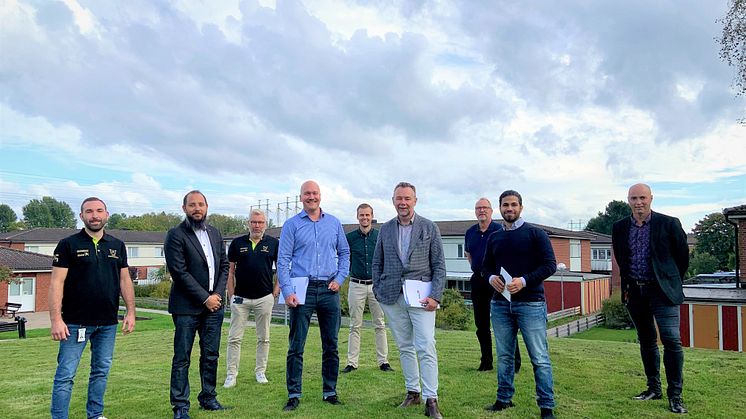På bilden från vänster till höger: Brahma Lilja Projektledare Serneke, Tony Georgiou, Styrelseordförande Eidar, Mats Pettersson Platschef Serneke, Christer Larsson Affärschef Serneke, Christoffer Sundin Arbetschef Serneke, Urban Blom Vd Eidar, Hans-Åke Projektledare Eidar, Abdo Moussaoui Projektledare Eidar och Stefan Jansson Fastighetsutvecklingschef Eidar.