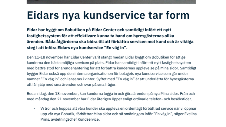 Den 11-18 november har Eidar Center varit stängt medan Eidar byggt om Bobutiken för att ge kunderna den bästa möjliga servicen på plats. Eidar har samtidigt infört ett nytt fastighetssystem med bättre stöd för ärendehantering för att förbättra kundernas upplevelse på Mina sidor. Samtidigt bygger Eidar också upp den interna organisationen för bolagets nya kundservice som går under namnet ”En väg in” och lanseras i vinter. Syftet med ”En väg in” är att underlätta för hyresgästerna att få hjälp med sina ärenden och svar på sina frågor.