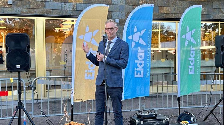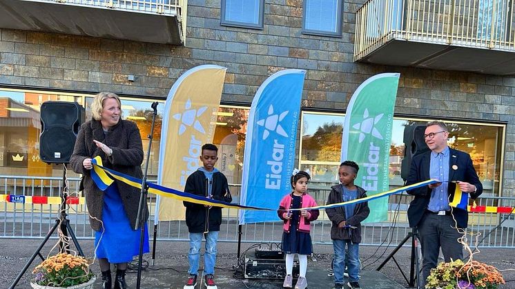 Eidars styrelseordförande Jennie Bergius Eriksson och vd Urban Blom berättade om den långa process som lett fram till dagens fina resultat. Jennie och Urban fick sedan hålla upp invigningsbandet så att de tre unga hyresgästerna Fatma, Hudefi och Harun kunde klippa bandet.