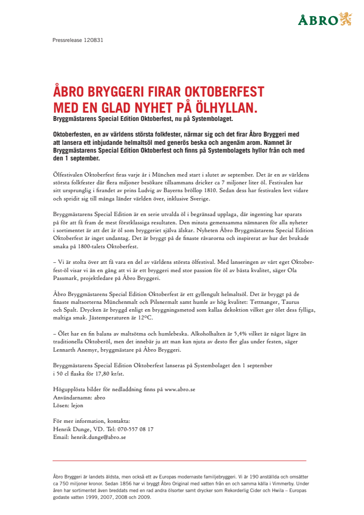Oktoberfesten, en av världens största folkfester, närmar sig och det firar Åbro Bryggeri med att lansera ett inbjudande helmaltsöl med generös beska och angenäm arom. Namnet är Bryggmästarens Special Edition Oktoberfest och finns på Systembolagets hyllor från och med den 1 september.