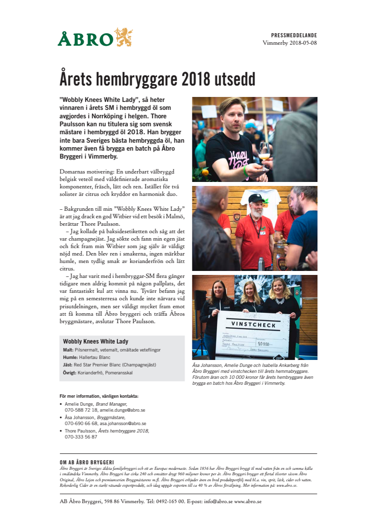 – Jag har varit med i hembryggar-SM flera gånger tidigare men aldrig kommit på någon pallplats, det var fantastiskt kul att vinna nu. Tyvärr befann jag mig på en semesterresa och kunde inte närvara vid prisutdelningen, men ser väldigt mycket fram emot att få komma till Åbro bryggeri och träffa Åbros bryggmästare, avslutar Thore Paulsson.