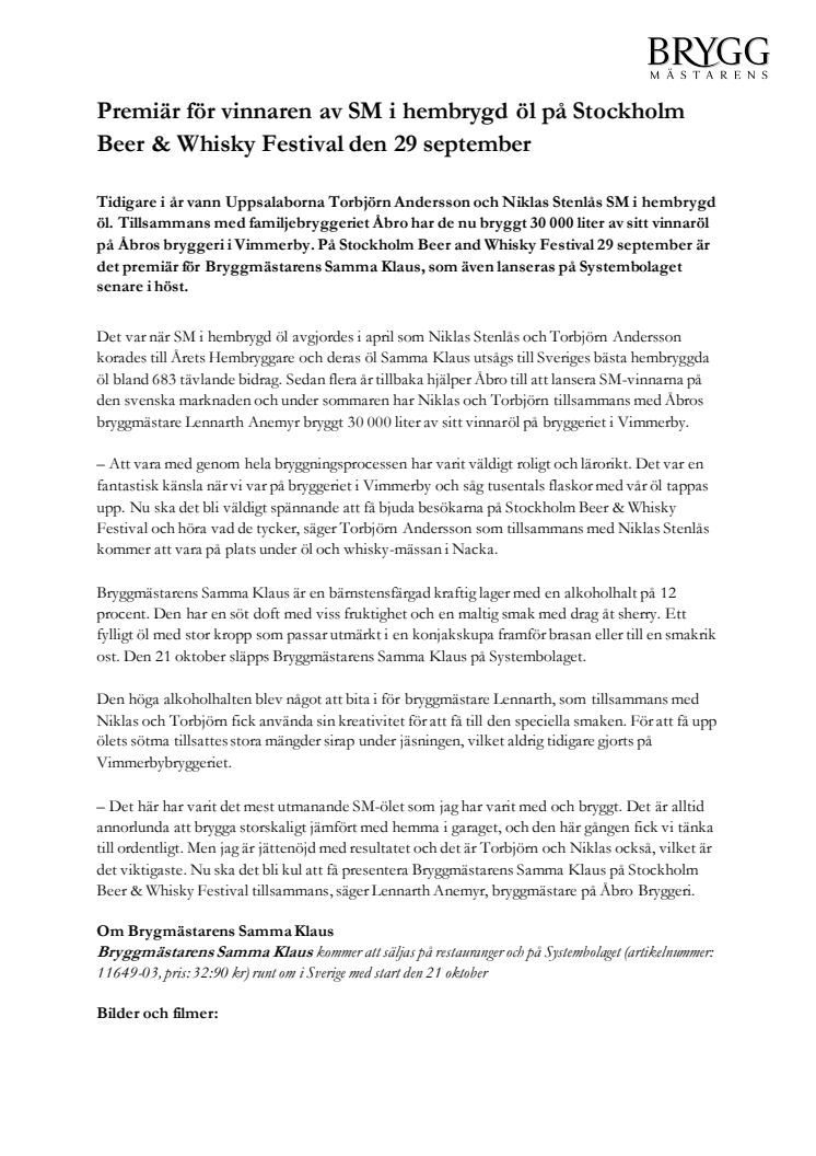 Tidigare i år vann Uppsalaborna Torbjörn Andersson och Niklas Stenlås SM i hembrygd öl. Tillsammans med familjebryggeriet Åbro har de nu bryggt 30 000 liter av sitt vinnaröl på Åbros bryggeri i Vimmerby. På Stockholm Beer and Whisky Festival 29 september är det premiär för Bryggmästarens Samma Klaus, som även lanseras på Systembolaget senare i höst.