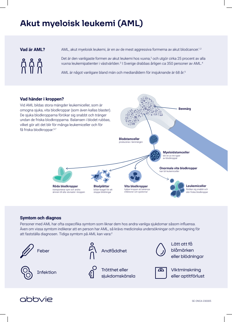 Faktablad om Akut myeloisk leukemi, AML, beskriver sjukdomen, symtom och diagnos, prognos och behandling.