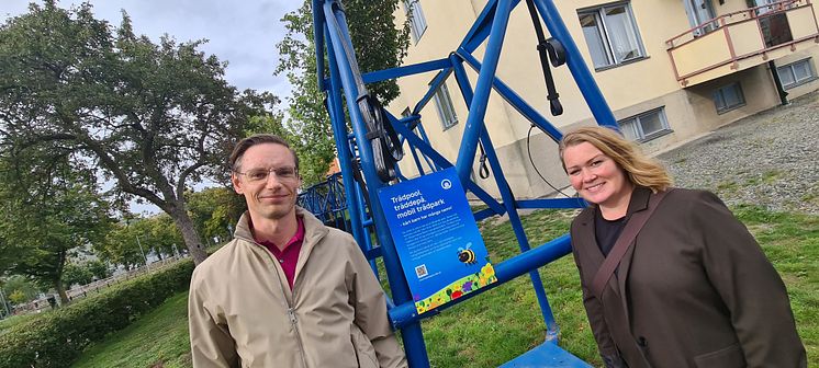ABK:s byggprojektledare för Östermalms Park Patrik Jogby och utemiljösamordnare Carolina Aouseus vid den nya trädpoolen.