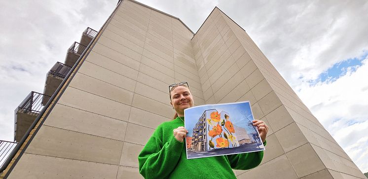 Konstnär Malin "Korallpionen" Sparrvardt med skissen framför väggen som ska målas.