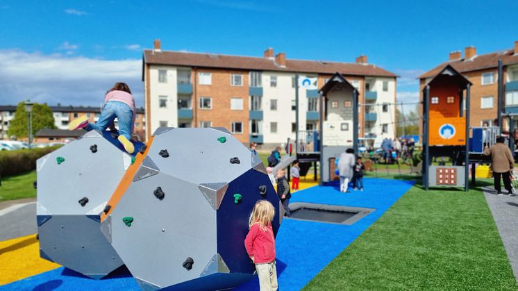 – Vi har velat göra en samlingsplats för hela familjen, men med utgångspunkt från vad barn på området vill ha, säger ABK:s utemiljösamordnare Carolina Aouseus som planerat den nya lekplatsen tillsammans med ABK:s förvaltning på området och entreprenören Kompan.