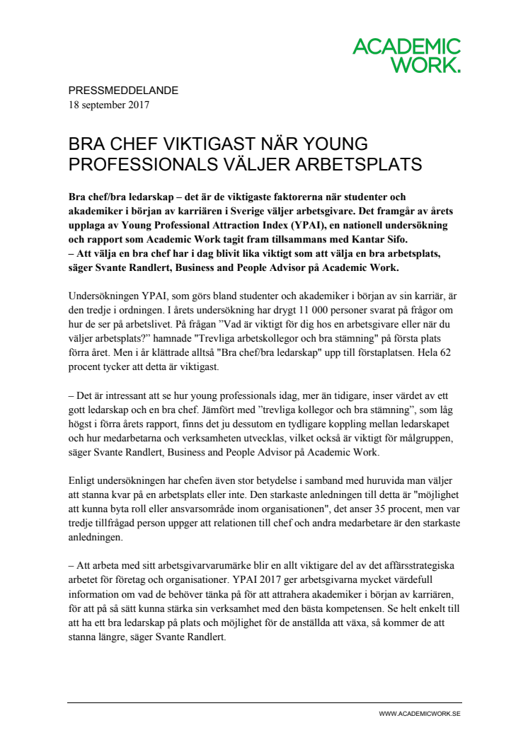 Bra chef/bra ledarskap – det är de viktigaste faktorerna när studenter och akademiker i början av karriären i Sverige väljer arbetsgivare. Det framgår av årets upplaga av Young Professional Attraction Index (YPAI), en nationell undersökning och rapport som Academic Work tagit fram tillsammans med Kantar Sifo.