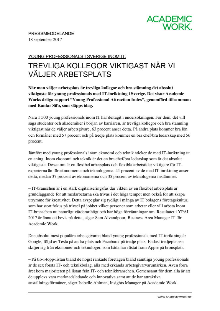 När man väljer arbetsplats är trevliga kollegor och bra stämning det absolut viktigaste för young professionals med IT-inriktning i Sverige. Det visar Academic Works årliga rapport ”Young Professional Attraction Index”, genomförd tillsammans med Kantar Sifo, som släpps idag.
