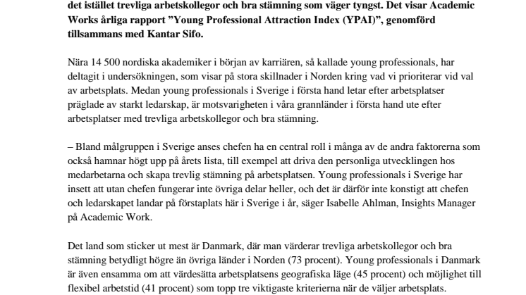 Nära 14 500 nordiska akademiker i början av karriären, så kallade young professionals, har deltagit i undersökningen, som visar på stora skillnader i Norden kring vad vi prioriterar vid val av arbetsplats. Medan young professionals i Sverige i första hand letar efter arbetsplatser präglade av starkt ledarskap, är motsvarigheten i våra grannländer i första hand ute efter arbetsplatser med trevliga arbetskollegor och bra stämning.