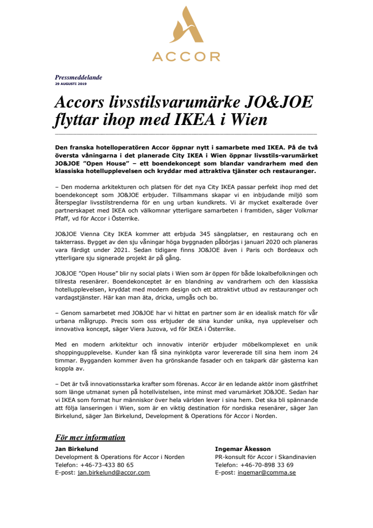 Den franska hotelloperatören Accor öppnar nytt i samarbete med IKEA. På de två översta våningarna i det planerade City IKEA i Wien öppnar livsstils-varumärket JO&JOE ”Open House” – ett boendekoncept som blandar vandrarhem med den klassiska hotellupplevelsen och kryddar med attraktiva tjänster och restauranger.