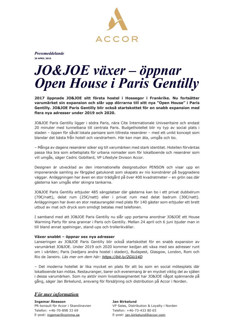 2017 öppnade JO&JOE sitt första hostel i Hossegor i Frankrike. Nu fortsätter varumärket sin expansion och slår upp dörrarna till sitt nya ”Open House” i Paris Gentilly. JO&JOE Paris Gentilly blir också startskottet för en snabb expansion med flera nya adresser under 2019 och 2020.
