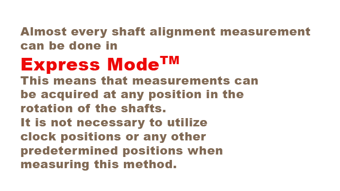 Almost every shaft alignment can be done in Tripoint or Express measuring methods. This means that measurements can be acquired at any position in the rotation of the shafts. It is not necessary to utilize clock positions or any other predetermined positions when measuring using either of these methods.