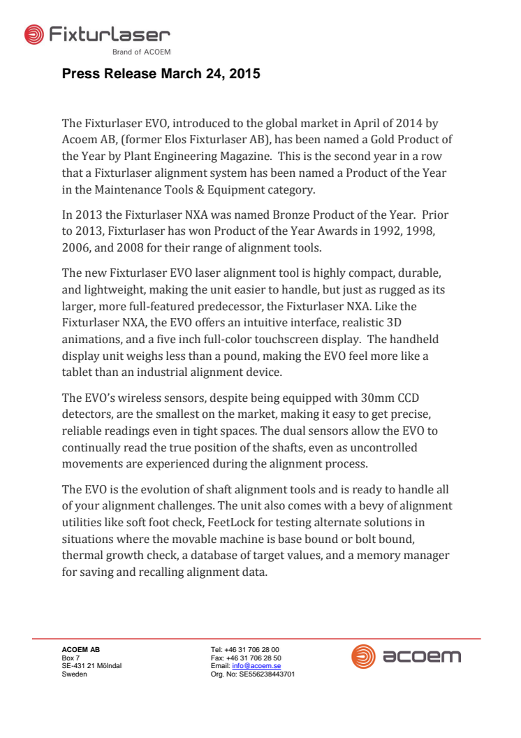 The Fixturlaser EVO, introduced to the global market in April of 2014 by Acoem AB, (former Elos Fixturlaser AB), has been named a Gold Product of the Year by Plant Engineering Magazine. This is the second year in a row that a Fixturlaser alignment system has been named a Product of the Year in the Maintenance Tools & Equipment category.