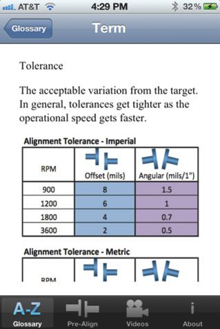 Align Terms App includes a glossary of over 90 terms plus in-depth pre-alignment procedures and instructional and informational videos. This content will be of great benefit to anyone in the shaft alignment field no matter what alignment tool they use. The Align Terms App can be downloaded free from the Apple App Store and from Google Play.
