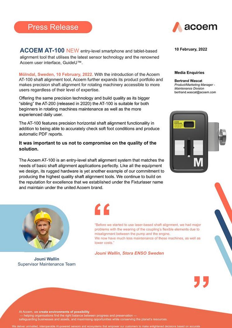 Mölndal, Sweden, 10 February, 2022. With the introduction of the Acoem AT-100 shaft alignment tool, Acoem further expands its product portfolio and makes precision shaft alignment for rotating machinery accessible to more users regardless of their level of expertise.