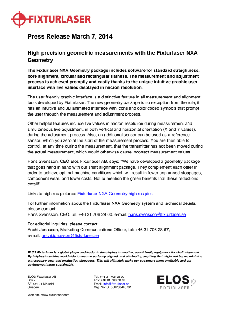 Hans Svensson, CEO Elos Fixturlaser AB, says: “We have developed a geometry package that goes hand in hand with our shaft alignment package. They complement each other in order to achieve optimal machine conditions which will result in fewer unplanned stoppages, component wear, and lower costs. Not to mention the green benefits that these reductions entail!”