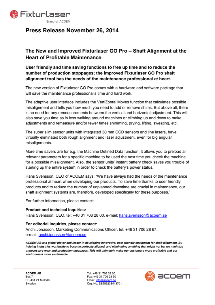 Hans Svensson, CEO of ACOEM says: “We always have the needs of the maintenance professional at heart when developing our products. To save time thanks to user friendly products and to reduce the number of unplanned downtime are crucial in maintenance, our shaft alignment systems are, therefore, developed specifically for these purposes.”