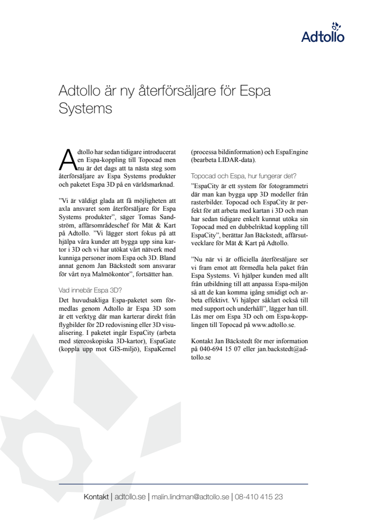 Adtollo har sedan tidigare introducerat en Espa-koppling till Topocad men nu är det dags att ta nästa steg som återförsäljare av Espa Systems produkter och paketet Espa 3D på en världsmarknad.