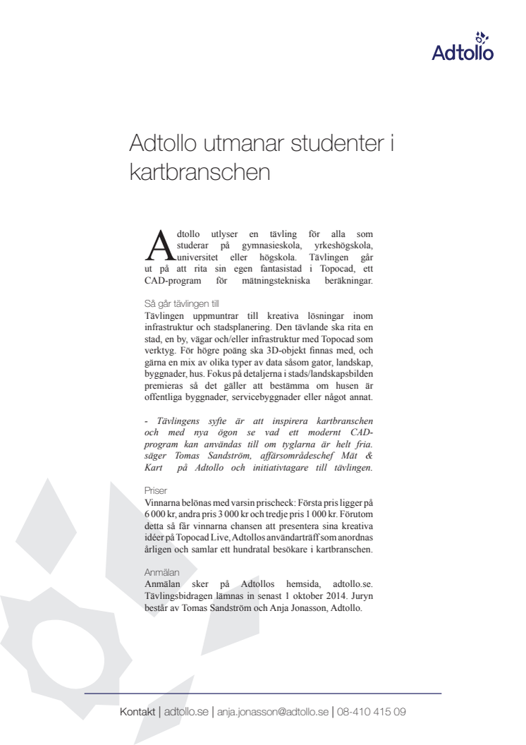 Adtollo utlyser en tävling för alla som studerar på gymnasieskola, yrkeshögskola, universitet eller högskola. Tävlingen går ut på att rita sin egen fantasistad i Topocad, ett CAD-program för mätningstekniska beräkningar. Tävlingen uppmuntrar till kreativa lösningar inom infrastruktur och stadsplanering. Den tävlande ska rita en stad, en by, vägar och/eller infrastruktur med Topocad som verktyg.