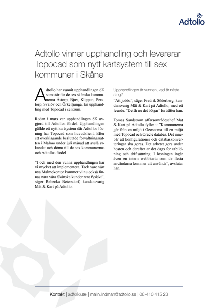 Adtollo har vunnit upphandlingen 6K som står för de sex skånska kommunerna Åstorp, Bjuv, Klippan, Perstorp, Svalöv och Örkelljunga. En upphandling där kartsystemet Topocad står i centrum.