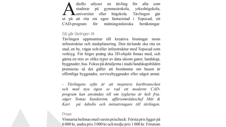 Adtollo utlyser en tävling för alla som studerar på gymnasieskola, yrkeshögskola, universitet eller högskola. Tävlingen går ut på att rita sin egen fantasistad i Topocad, ett CAD-program för mätningstekniska beräkningar.