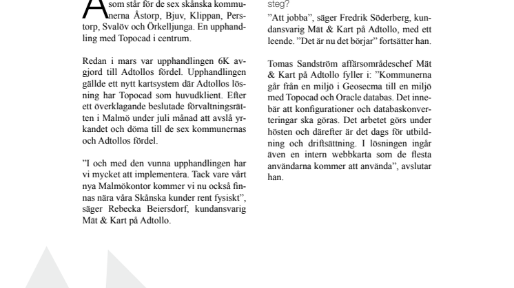 Redan i mars var upphandlingen 6K avgjord till Adtollos fördel. Upphandlingen gällde ett nytt kartsystem där Adtollos lösning har Topocad som huvudklient. Efter ett överklagande beslutade förvaltningsrätten i Malmö under juli månad att avslå yrkandet och döma till de sex kommunernas och Adtollos fördel.