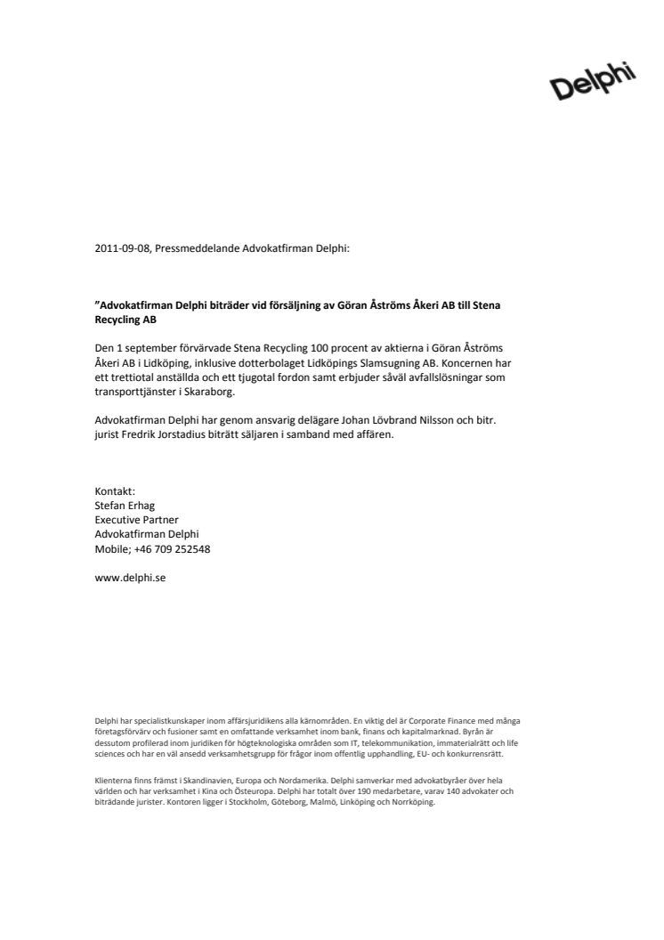 Advokatfirman Delphi biträder vid försäljning av Göran Åströms Åkeri AB till Stena Recycling AB
