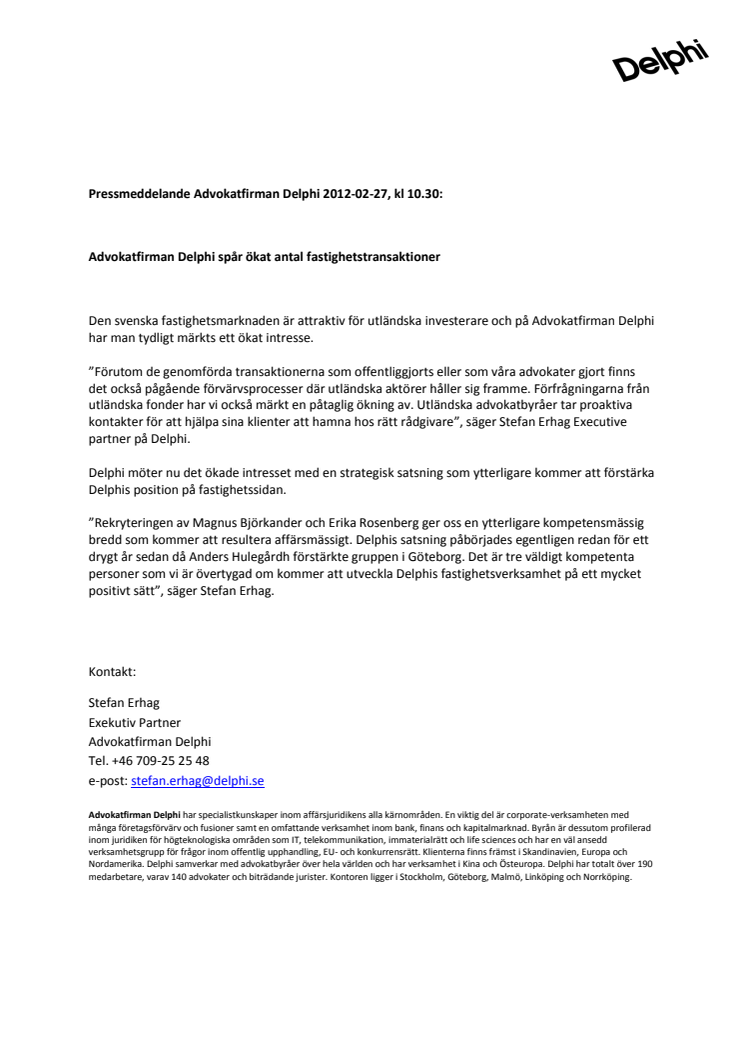 Den svenska fastighetsmarknaden är attraktiv för utländska investerare och på Advokatfirman Delphi har man tydligt märkts ett ökat intresse. Delphi möter nu det ökade intresset med en strategisk satsning som ytterligare kommer att förstärka Delphis position på fastighetssidan.