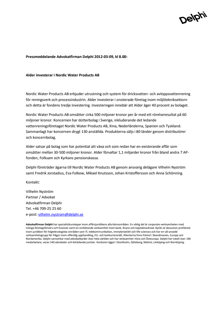 Nordic Water Products AB erbjuder utrustning och system för dricksvatten- och avloppsvattenrening för reningsverk och processindustrin. Alder investerar i onoterade företag inom miljötekniksektorn och detta är fondens tredje investering. Investeringen innebär att Alder äger 40 procent av bolaget. Delphi företräder ägarna till Nordic Water Products AB genom ansvarig delägare Vilhelm Nyström.