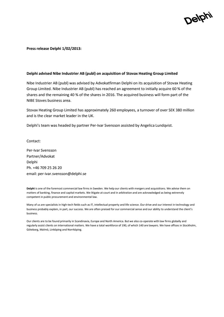 Nibe Industrier AB (publ) was advised by Advokatfirman Delphi on its acquisition of Stovax Heating Group Limited. Nibe Industrier AB (publ) has reached an agreement to initially acquire 60 % of the shares and the remaining 40 % of the shares in 2016. The acquired business will form part of the NIBE Stoves business area.
