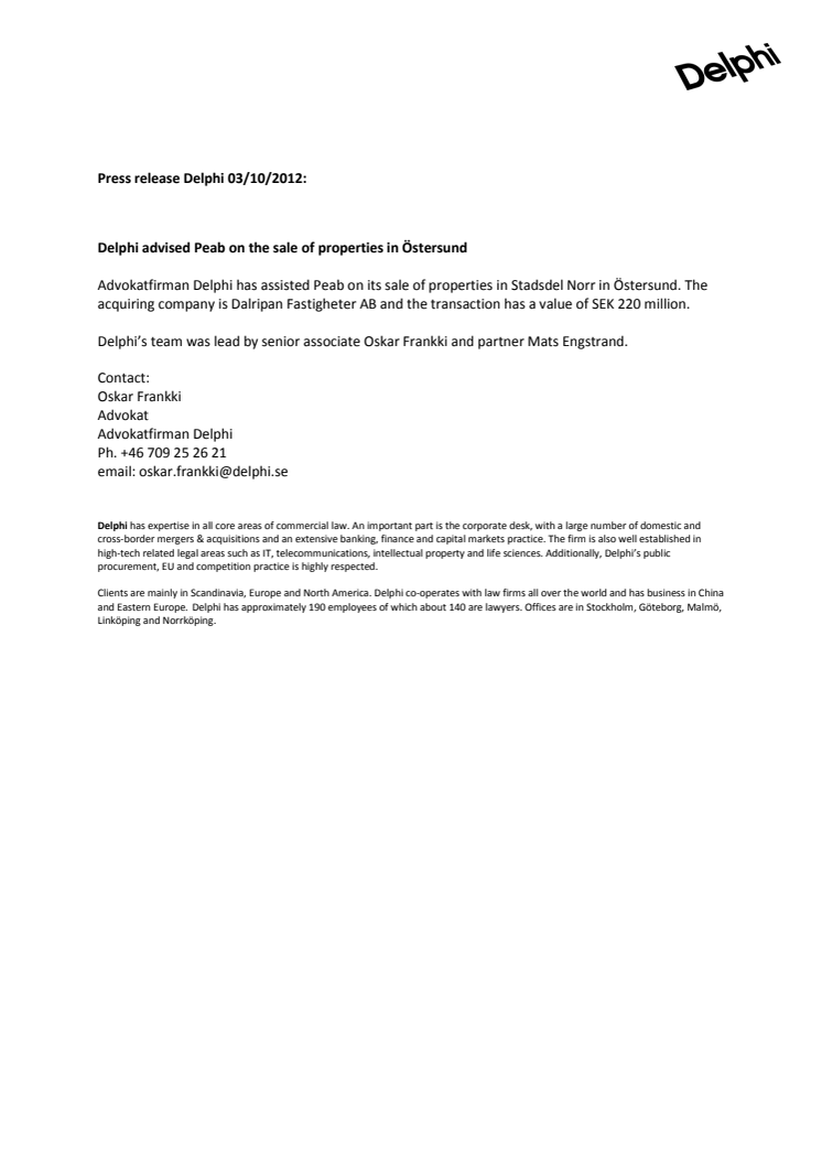 Advokatfirman Delphi has assisted Peab on its sale of properties in Stadsdel Norr in Östersund. The acquiring company is Dalripan Fastigheter AB and the transaction has a value of SEK 220 million.