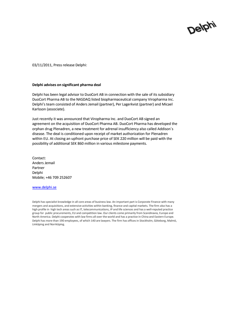 Delphi has been legal advisor to DuoCort AB in connection with the sale of its subsidiary DuoCort Pharma AB to the NASDAQ listed biopharmaceutical company Viropharma Inc. Delphi’s team consisted of Anders Jemail (partner), Per Lagerkvist (partner) and Micael Karlsson (associate).
