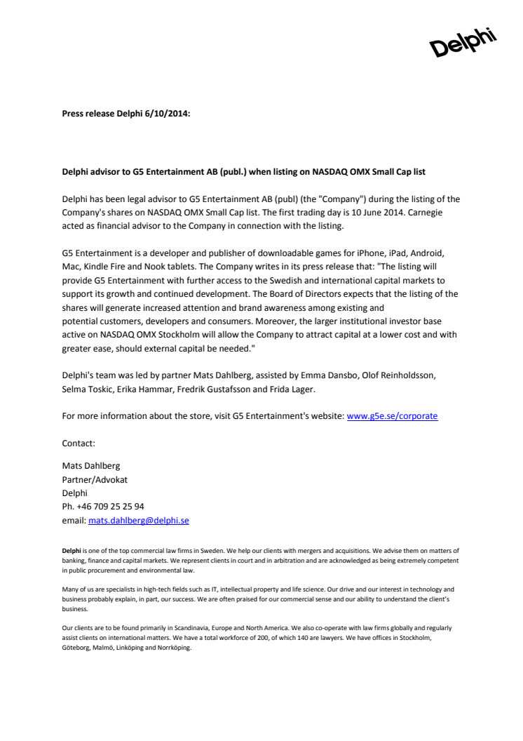 Delphi has been legal advisor to G5 Entertainment AB (publ) (the "Company") during the listing of the Company's shares on NASDAQ OMX Small Cap list. The first trading day is 10 June 2014. Carnegie acted as financial advisor to the Company in connection with the listing.