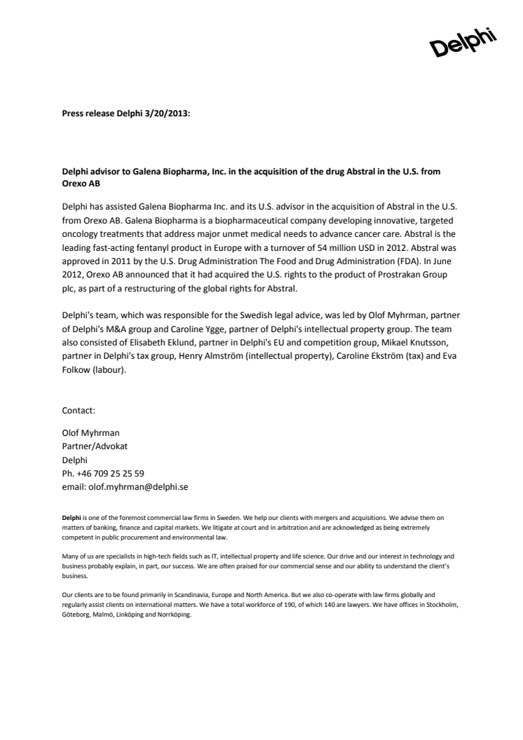 Delphi advisor to Galena Biopharma, Inc. in the acquisition of the drug Abstral in the U.S. from Orexo AB