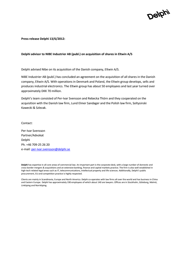 Delphi advisor to NIBE Industrier AB (publ.) on acquisition of shares in Eltwin A/S