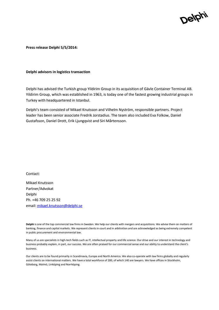 Delphi has advised the Turkish group Yildirim Group in its acquisition of Gävle Container Terminal AB. Yildirim Group, which was established in 1963, is today one of the fastest growing industrial groups in Turkey with headquartered in Istanbul.