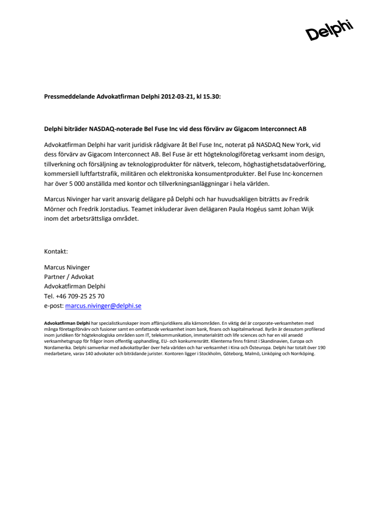 Advokatfirman Delphi har varit juridisk rådgivare åt Bel Fuse Inc, noterat på NASDAQ New York, vid dess förvärv av Gigacom Interconnect AB. Bel Fuse är ett högteknologiföretag verksamt inom design, tillverkning och försäljning av teknologiprodukter.