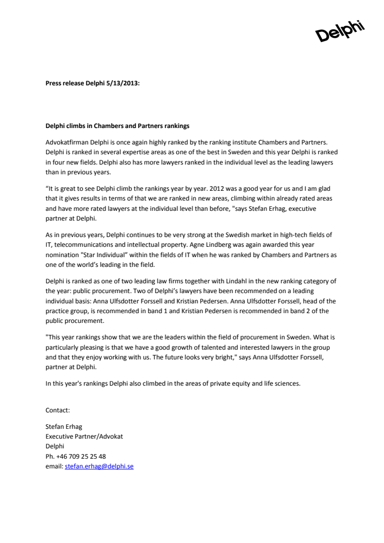 Advokatfirman Delphi is once again highly ranked by the ranking institute Chambers and Partners. Delphi is ranked in several expertise areas as one of the best in Sweden and this year Delphi is ranked in four new fields. Delphi also has more lawyers ranked in the individual level as the leading lawyers than in previous years.