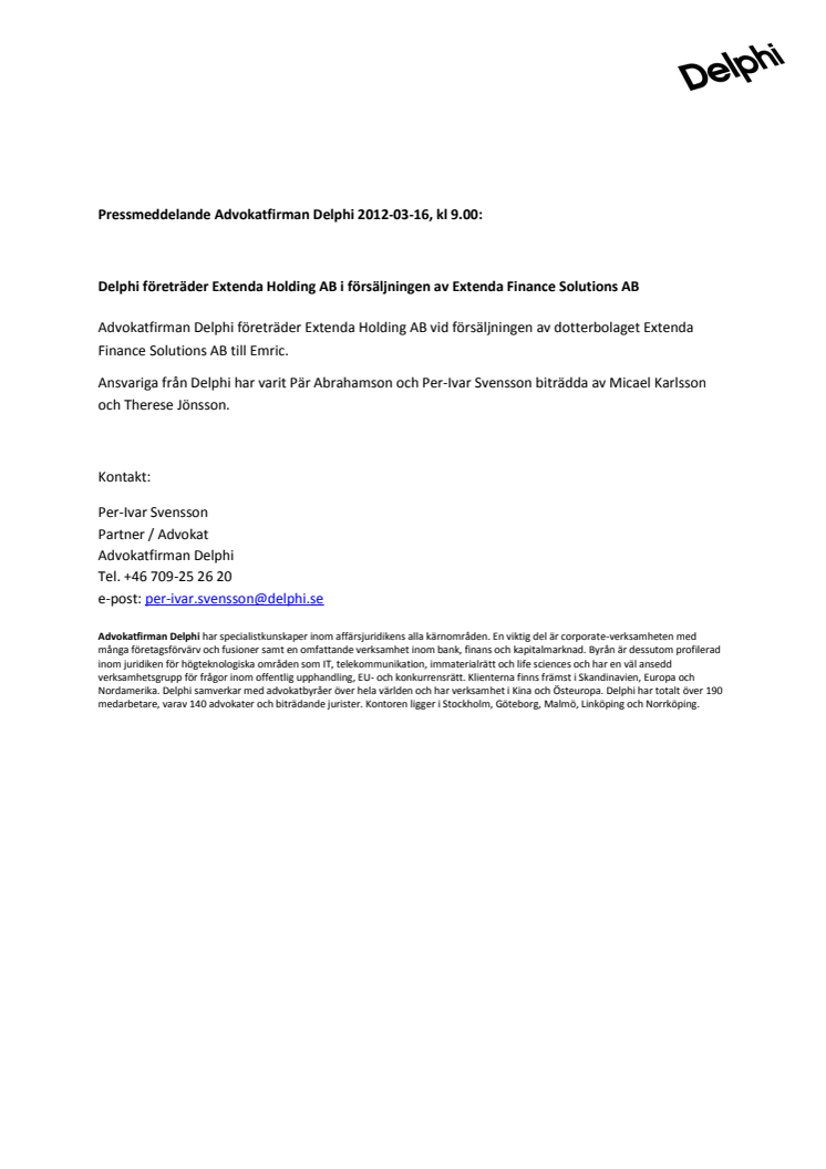 Advokatfirman Delphi företräder Extenda Holding AB vid försäljningen av dotterbolaget Extenda Finance Solutions AB till Emric.