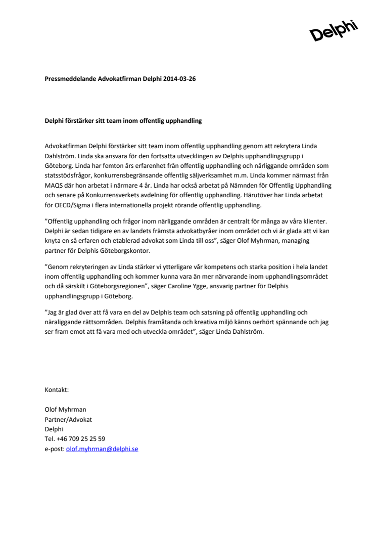 Advokatfirman Delphi förstärker sitt team inom offentlig upphandling genom att rekrytera Linda Dahlström. Linda ska ansvara för den fortsatta utvecklingen av Delphis upphandlingsgrupp i Göteborg. Linda har femton års erfarenhet från offentlig upphandling och närliggande områden som statsstödsfrågor, konkurrensbegränsande offentlig säljverksamhet m.m.