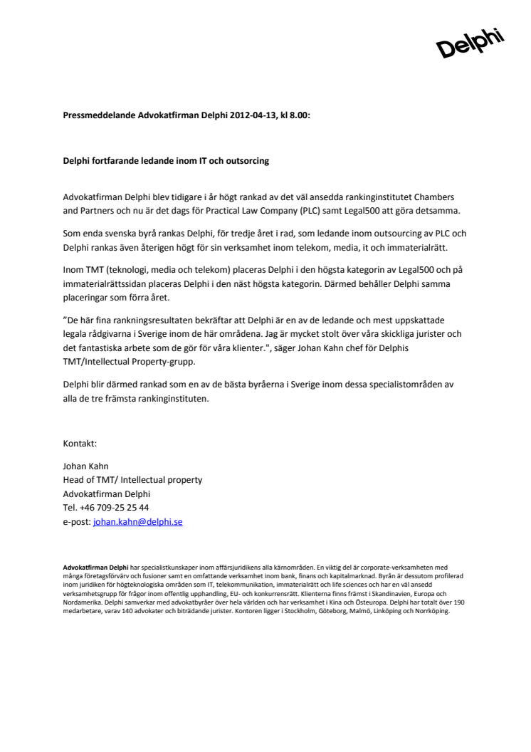 Som enda svenska byrå rankas Delphi, för tredje året i rad, som ledande inom outsourcing av PLC och Delphi rankas även återigen högt för sin verksamhet inom telekom, media, it och immaterialrätt.
