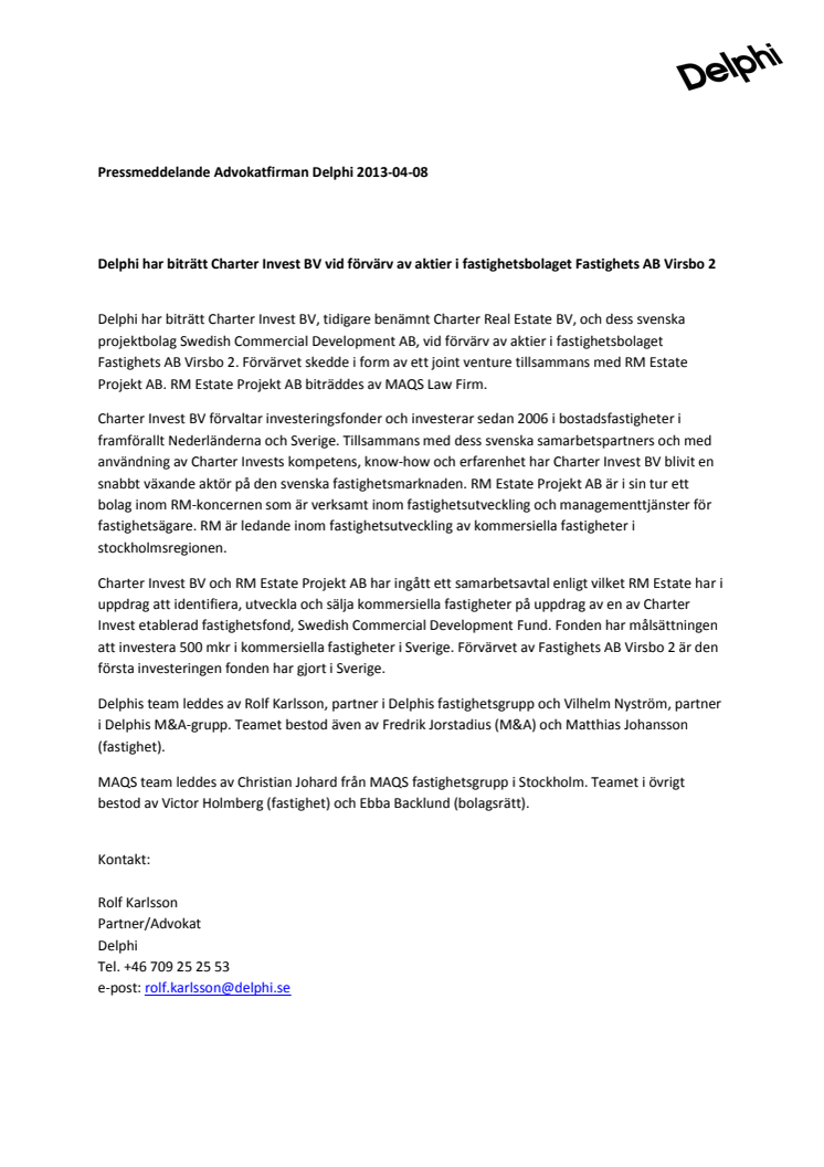 Delphi har biträtt Charter Invest BV, tidigare benämnt Charter Real Estate BV, och dess svenska projektbolag Swedish Commercial Development AB, vid förvärv av aktier i fastighetsbolaget Fastighets AB Virsbo 2. Förvärvet skedde i form av ett joint venture tillsammans med RM Estate Projekt AB. RM Estate Projekt AB biträddes av MAQS Law Firm.