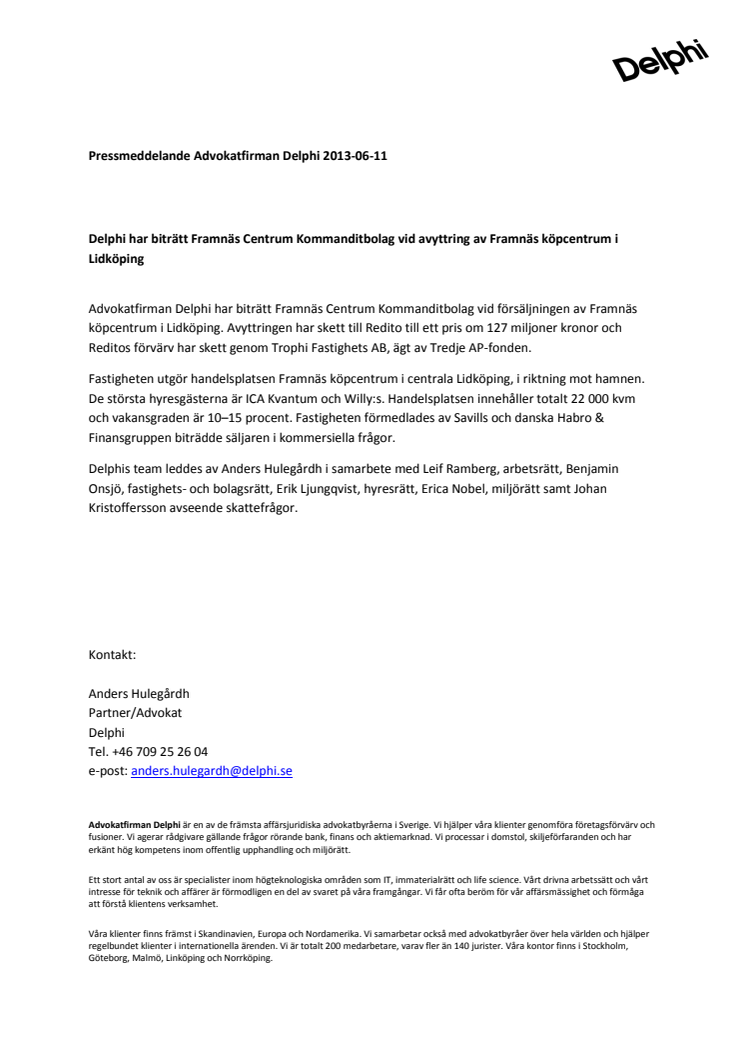Advokatfirman Delphi har biträtt Framnäs Centrum Kommanditbolag vid försäljningen av Framnäs köpcentrum i Lidköping. Avyttringen har skett till Redito till ett pris om 127 miljoner kronor och Reditos förvärv har skett genom Trophi Fastighets AB, ägt av Tredje AP-fonden.