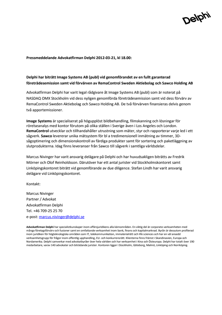 Advokatfirman Delphi har varit legal rådgivare åt Image Systems AB (publ), som är noterat på NASDAQ OMX Stockholm, vid dess nyligen genomförda företrädesemission samt vid dess förvärv av RemaControl Sweden Aktiebolag och Sawco Holding AB. De två förvärven finansieras delvis genom två apportemissioner.