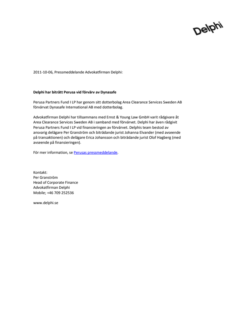 Advokatfirman Delphi har tillsammans med Ernst & Young Law GmbH varit rådgivare åt Perusas dotterbolag Area Clearance Services Sweden AB i samband med förvärvet av Dynasafe International AB med dotterbolag. Delphi har även rådgivit Perusa vid finansieringen av förvärvet.
